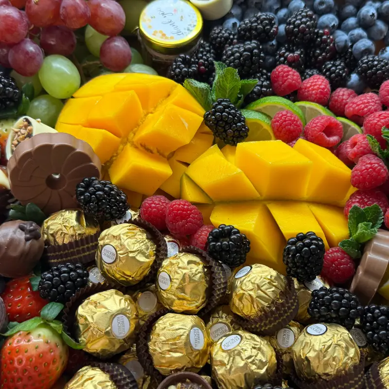 • Fresh Fruits: Green grapes, red grapes, strawberries, kiwi, oranges, apples, blackberries, blueberries